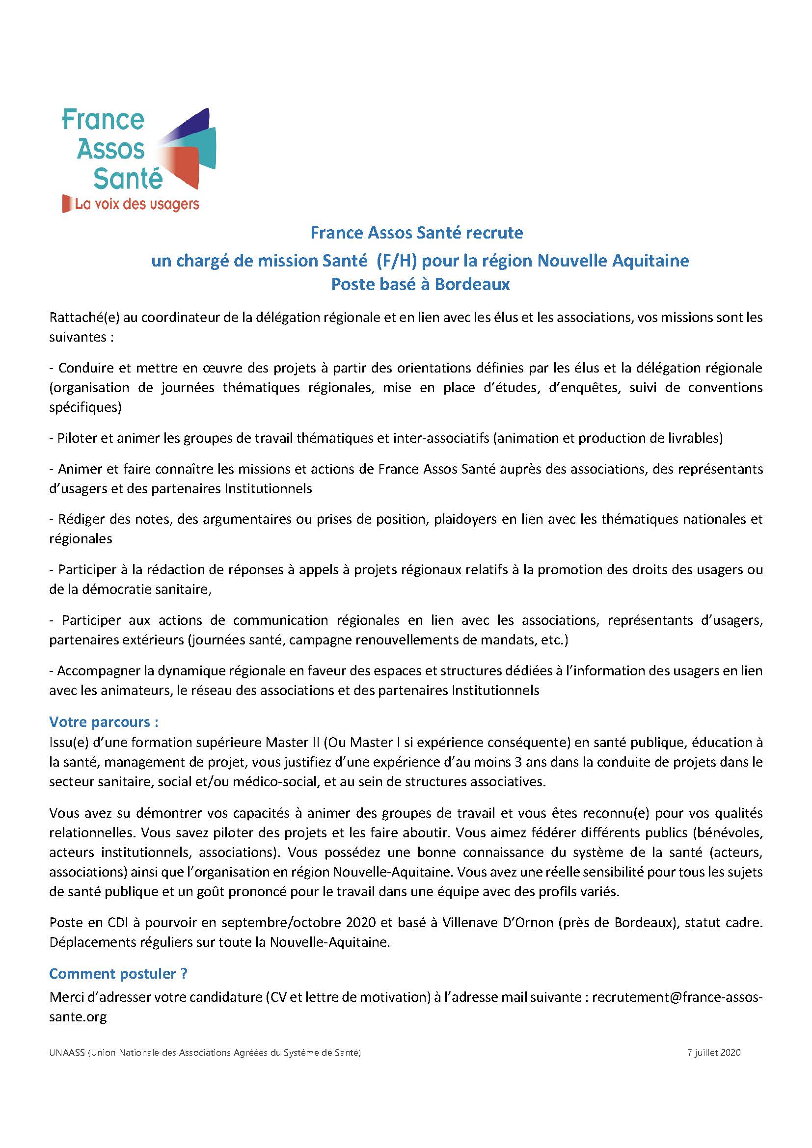 Merci d’adresser votre candidature (CV et lettre de motivation) à l’adresse mail suivante : recrutement@france-assos-sante.org