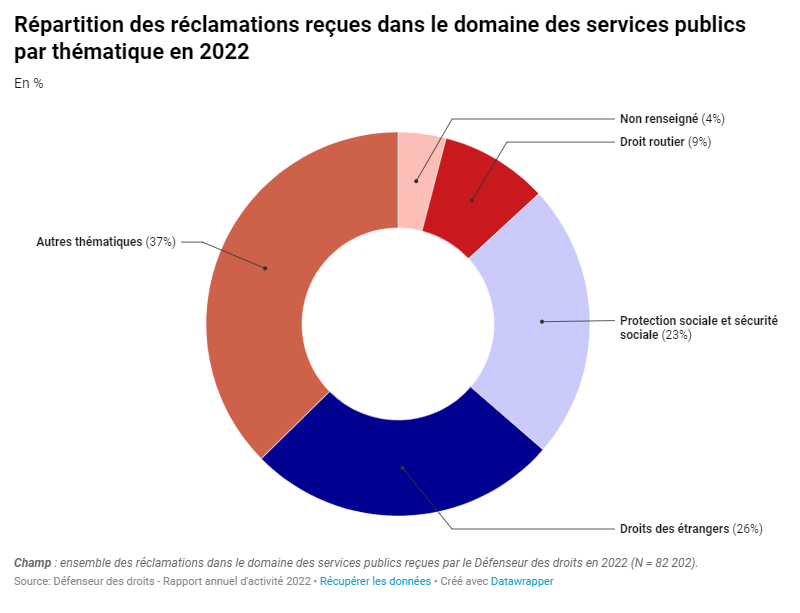 Retrouvez la répartition des réclamations reçues dans le domaines des services publics par thématique en 2022 :