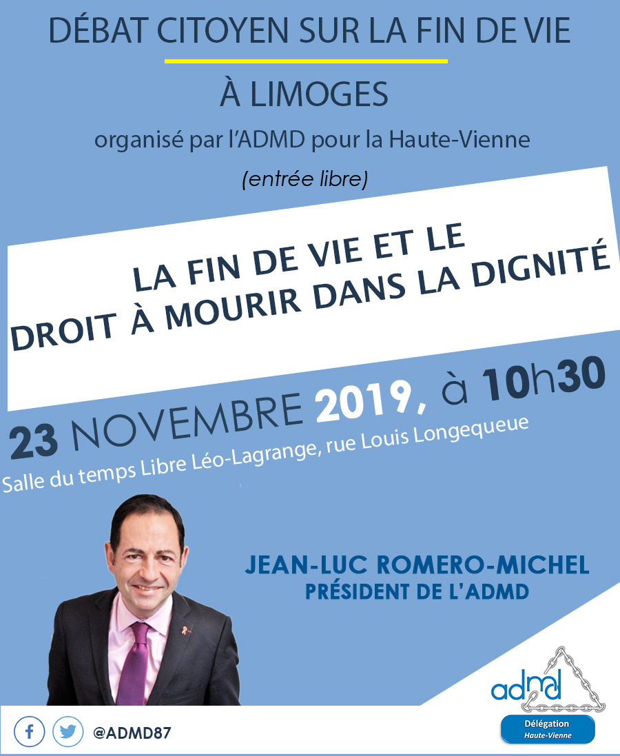 L’association ADMD 87 organise un débat citoyen sur la fin de vie (entrée libre) le 23 novembre 2019 à 10h30 salle du temps libre Léo Lagrange 87000 Limoges