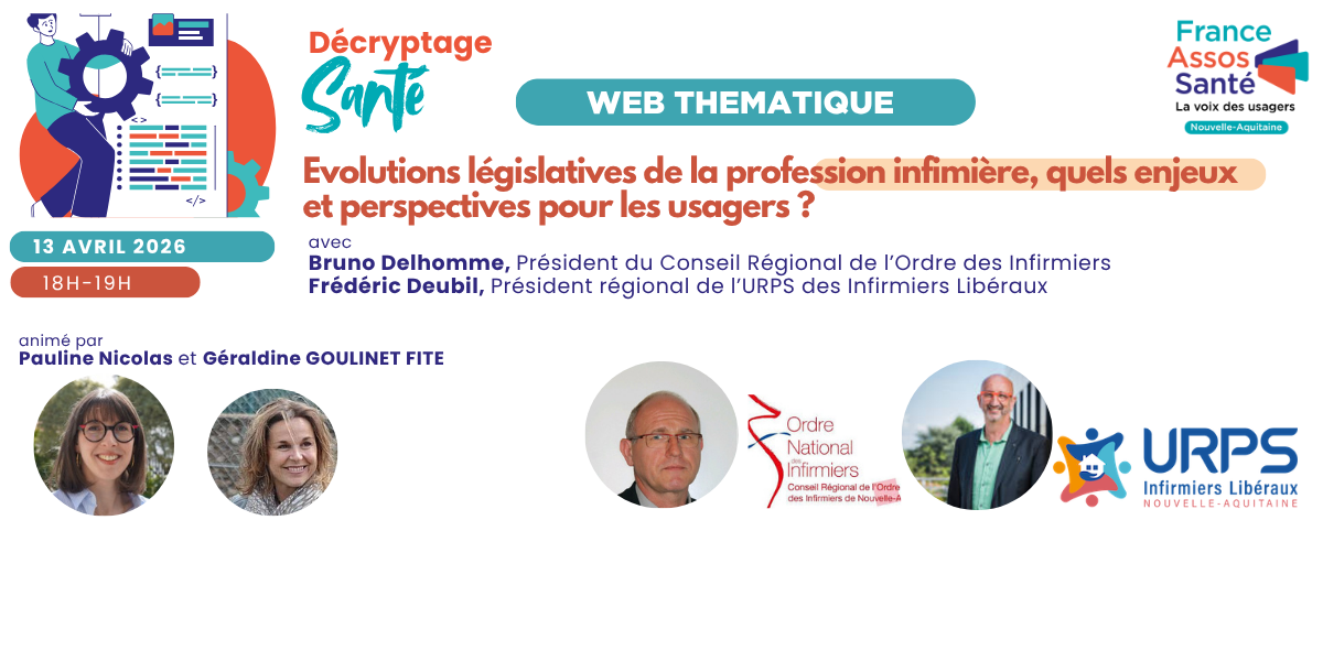 Un rendez-vous pour comprendre, questionner et imaginer ensemble le futur du soin infirmier proposé par France Assos Santé Nouvelle-Aquitaine en étroite collaboration avec le Conseil Régional de l’Ordre des infirmiers et l’URPS des infirmiers libéraux de Nouvelle-Aquitaine