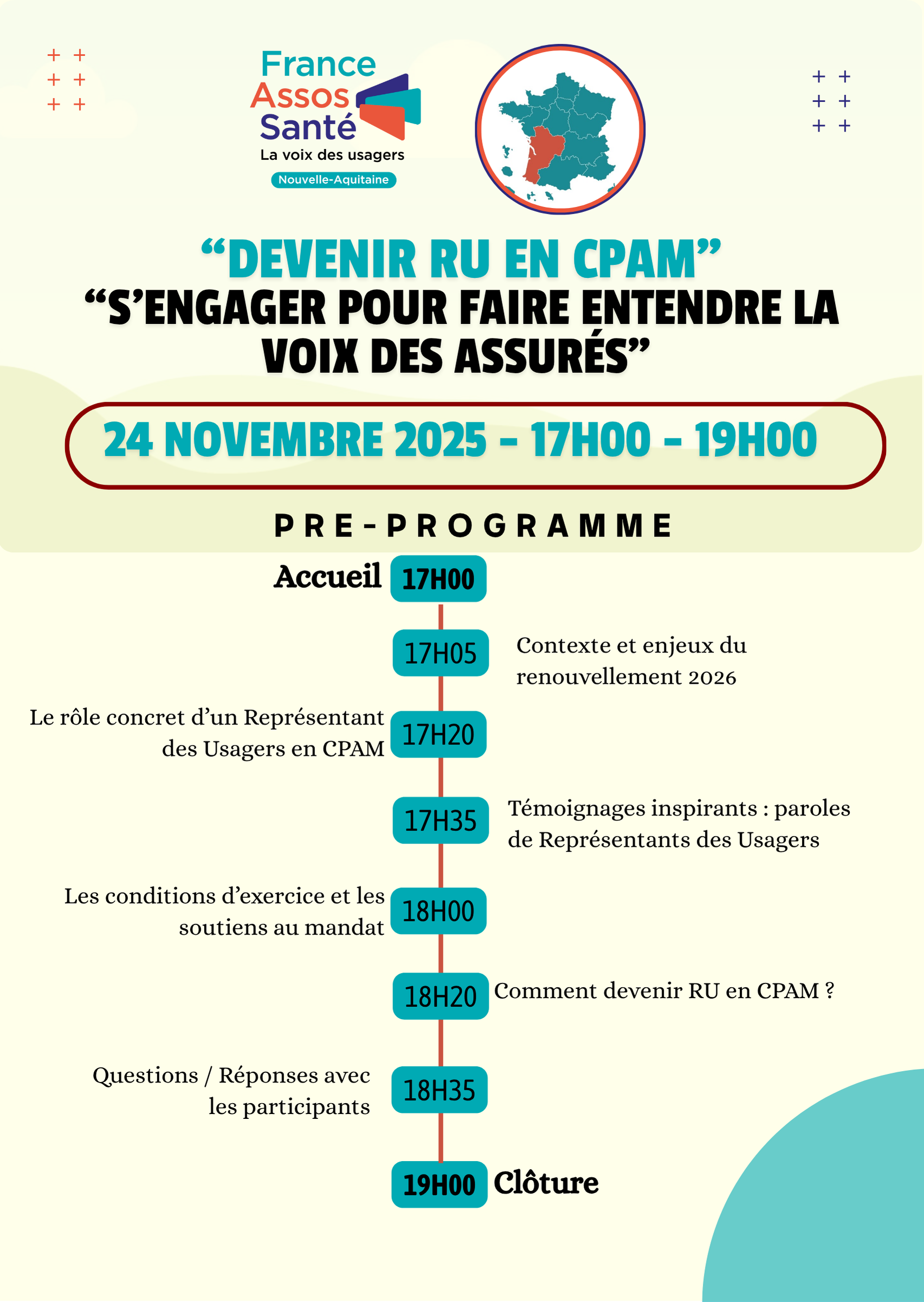 Webinaire devenez RU en Caisse Primaire d’Assurance Maladie (CPAM) Informations concernant cet evenement Date : Le 24 novembre 2025 Heure : De 17:00 à 19:00 Article précédent JOURNEE REGIONALE DES PROTOCOLES DE COOPERATION EN SANTE Article suivant SANTE et TERRITOIRES : Olivier VERAN en grand Témoin de cette journée territoriale d'échanges